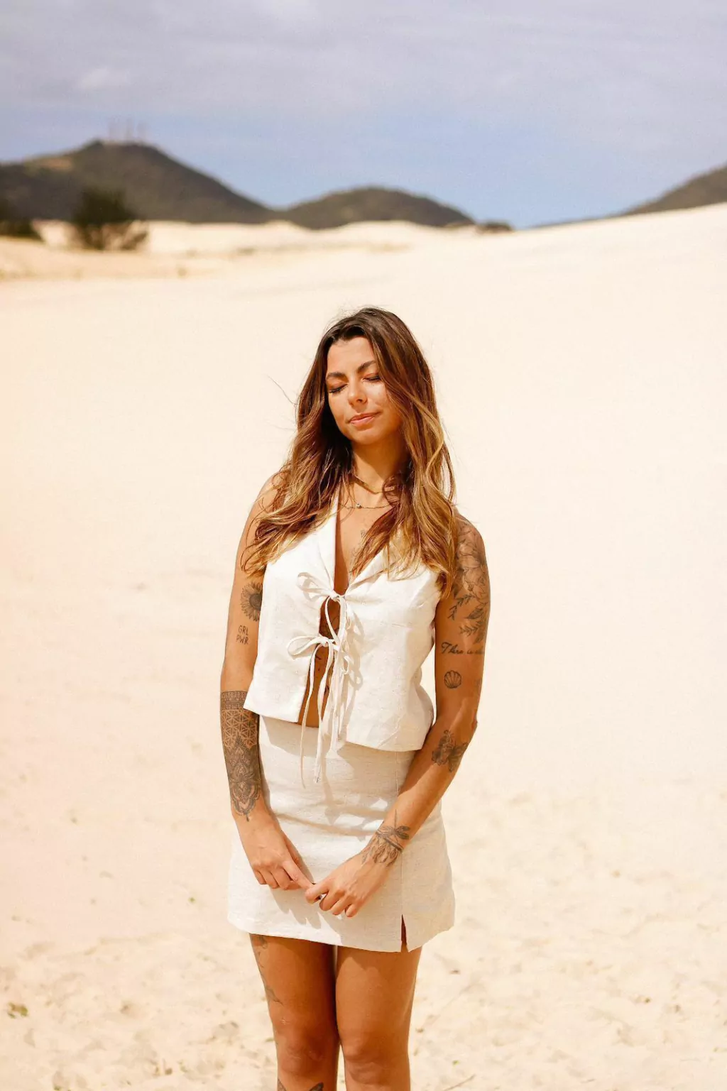- O colete Lara possui corte reto e resolvemos trazer uma proposta mais despojada para essa peça e tirar o "ar" de formalidade que um colete passa. Adaptando a tendência dos lacinhos para o fechamento e incluindo uma gola virada.
