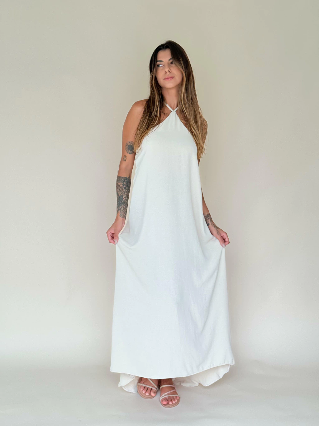 - Vestido longo modelagem fluída, ajustável no pescoço e decote nas costas;