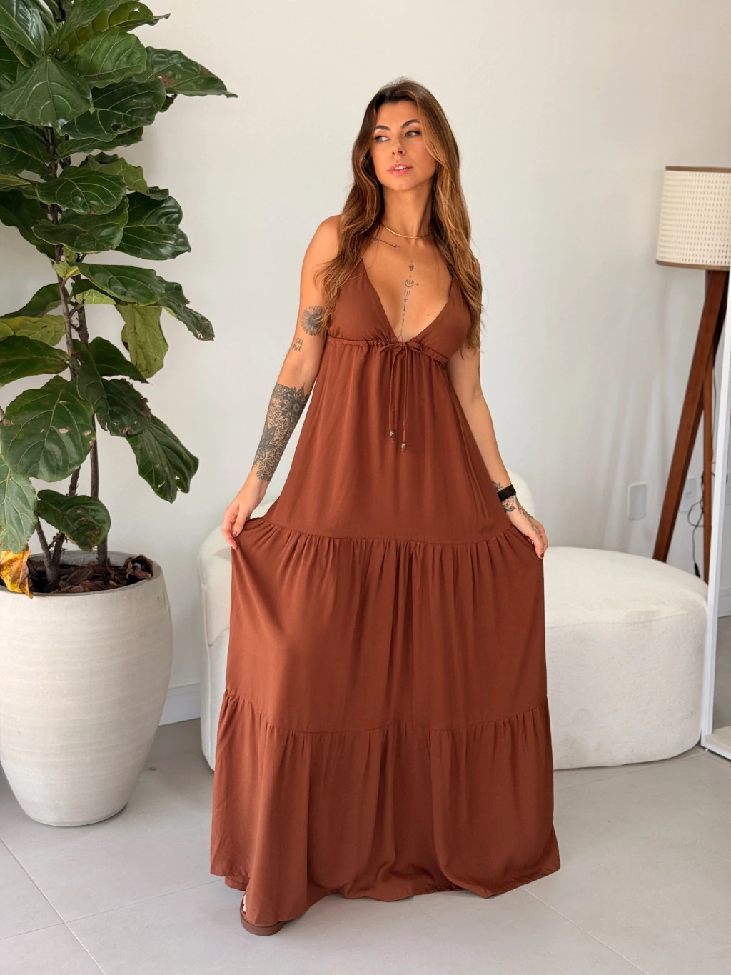 O Vestido Izabell é aquele modelo que une conforto e sofisticação na medida certa. De comprimento longo e modelagem ampla, ele proporciona um caimento fluido e cheio de movimento, ideal para quem ama peças com toque leve e elegante.